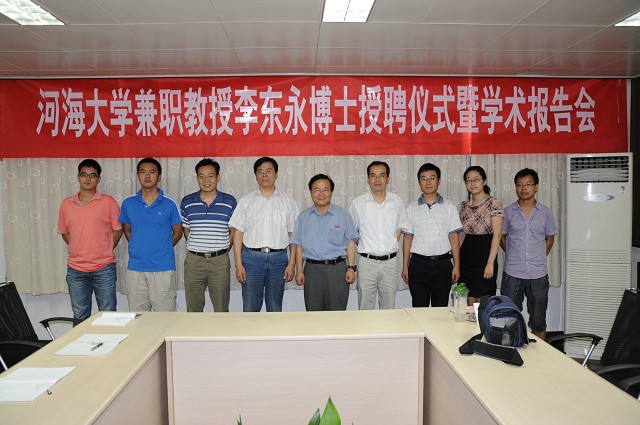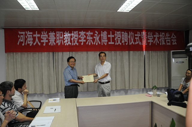 2011年7月4日上午,河海大学兼职教授李东永博士受聘仪式暨学术报告会在水文水资源与水利工程科学国家重点实验室举行。授聘仪式由国家重点实验室主任彭世彰教授主持。港口海岸及近海工程学院院长郑金海教授、河海大学“河口海岸综合治理与保护”方向团队研究人员出席了聘任仪式。仪式上,郑金海院长向李东永博士颁发河海大学兼职教授聘书,学生代表为李东永博士佩戴校徽并献花。仪式结束后,李东永教授做了题为“How to Establish Operational Coastal Modeling System along the Coast of China”的报告,并与师生展开了激烈讨论。