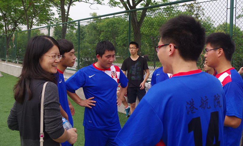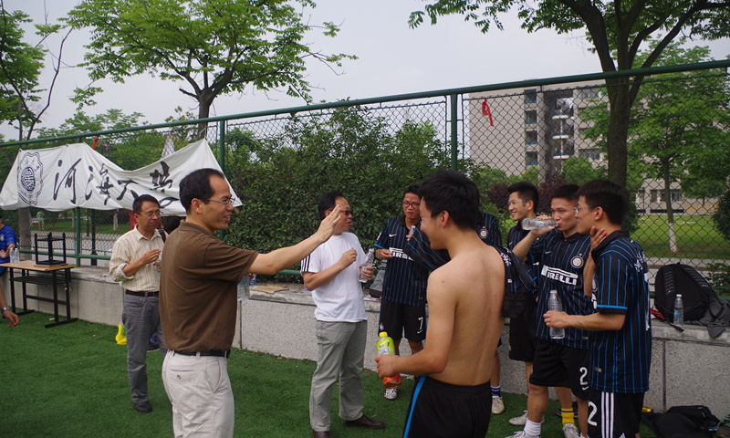 中场休息时分,郑金海院长、胡忠华书记以及姜海霞副书记与参加比赛的球员们进行了深切的交流。郑院长和胡书记夸赞了研究生队的稳定表现,并点名表扬了13、14级本科生中表现不错的队员。而研究生队与本科生队的队员也趁着休息时间,不仅交流了足球技巧,还讨论了许多与学业有关的话题。