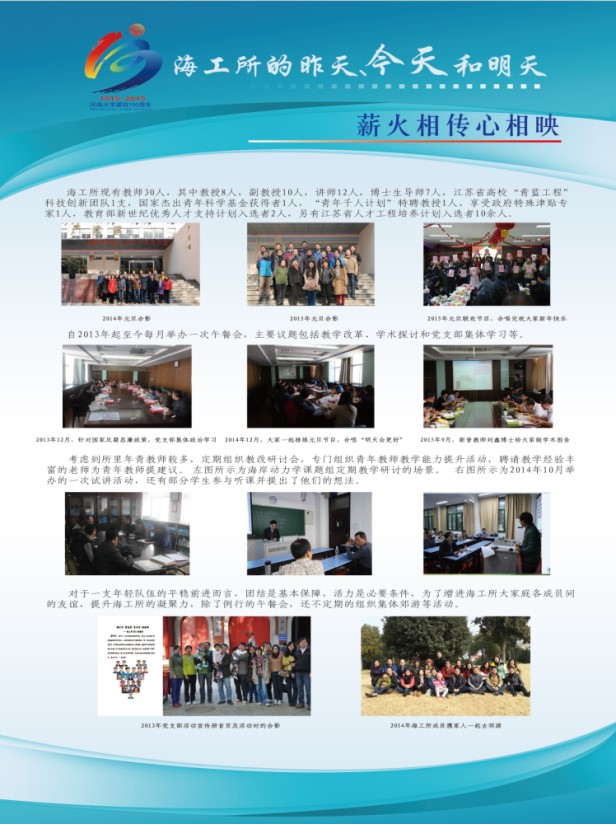 2015年10月25日至31日,金神赌场 海工党支部在河海大学校党委组织部和金神赌场 党委的共同支持下,举办了主题为“海工的昨天、今天和明天”的文化展活动。展览过程中,除了海工党支部全体党员专门组织了观展和学习活动外,学校的师生员工以及校庆期间返校的校友们等约三百余人次参与了该活动。本次展览活动旨在通过对海工辉煌历史的梳理,提升海工所全体教师的集体荣誉感;通过对海工文化精神的凝练,实现海工精神的传承与可持续发展;通过对海工过去成绩、现在工作以及未来愿景的展示,促进海工人的自我认可,树立着海工精神在全院以及全校文化建设中的模范形象。