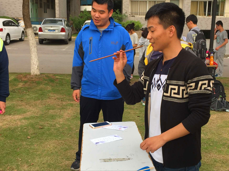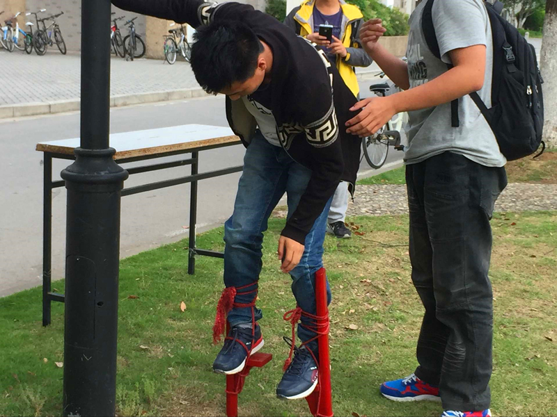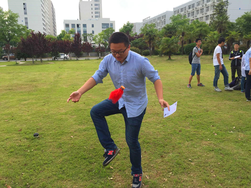 运动会分为七个项目同时进行:投壶、滚铁环、扔沙包、踢毽子、踩高跷、斗鸡、抽陀螺。投壶是将有限的飞镖投到地上的木筒中,考验的是准度和力度的结合。滚铁环是很多人童年的游戏,承载着简单的快乐。扔沙包,踢毽子,斗鸡……同学们都热烈开心地挥洒着汗水,在阳光下留下大学生活的剪影。