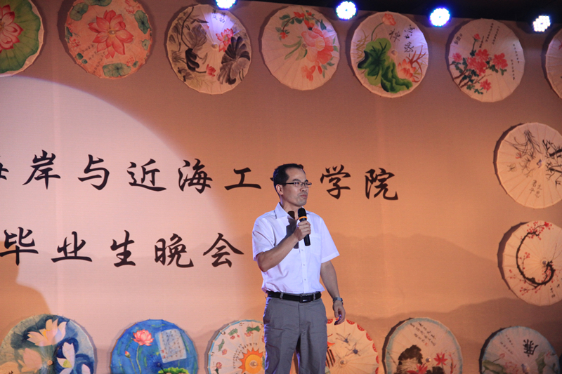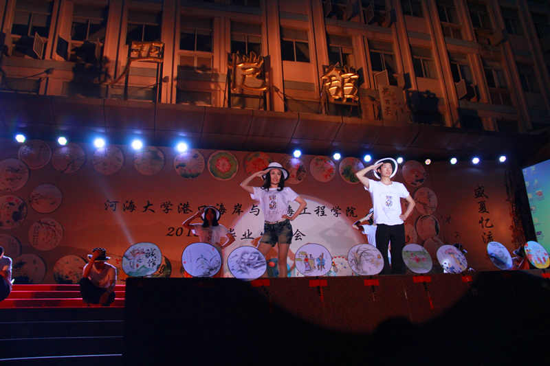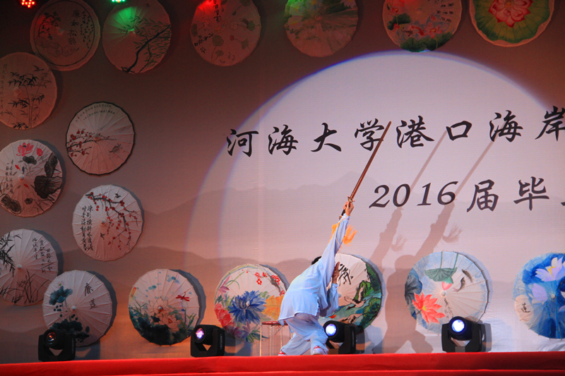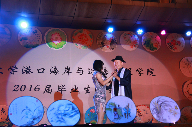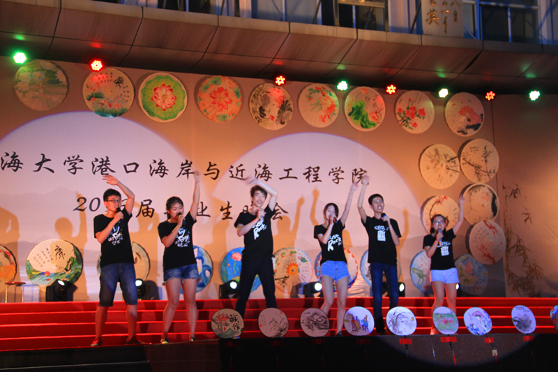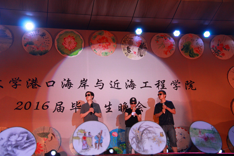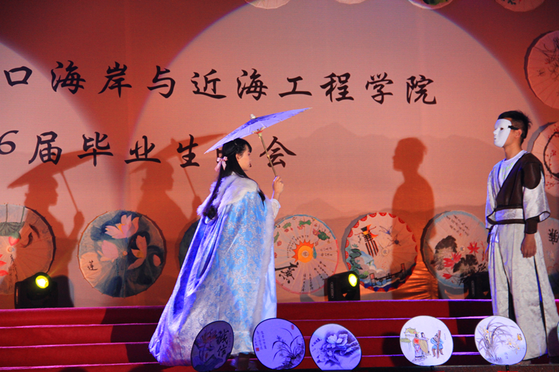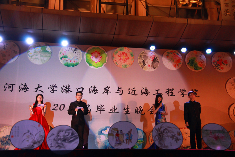 晚会会场整体风格为传统水墨风,以廉洁主题手绘花伞、诚信主题手绘面扇装饰,主题墙以传统文化中“四君子“为背景,蕴含着学院对毕业生的希冀和祝愿。整场晚会由学院2016届毕业生自编、自导、自演,现场气氛温馨融洽、高潮迭起。晚会在研究生一段活力四射的啦啦操《青春派对》中拉开帷幕,合唱《南山南(河海版)》、话剧《五十年后》、相声《我的大学生活》、诗朗诵《如果在河海拥有爱情》等等形式多样、内容丰富的节目,无不表达了毕业生对大学生活的留念之情和对母校的深深祝福。晚会期间,郑金海院长亲自为毕业生献上祝福,邵宇阳、张弛、周晶晶三位班主任参与表演,为同学们的大学生活画上圆满的句号。