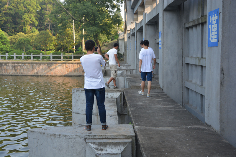 26日,迎着清晨灿烂的日光,吹着咸咸的海风,队员们驱车到达了东台条子泥围垦区最外沿的海堤上。这时潮已落去,阳光洒在潮沟遍布的滩地上,波光粼粼,美不胜收。堤坝外侧时而是扭王石高高杂乱的地堆砌着,时而是栅板整齐地排列,时而是肥美的水草油油地招摇。成员们向堤坝内侧看,是成片成片的刺槐树。当队员们欣赏美丽风光的时候,同行的导师李欢副教授介绍说:在东台围垦区,有的海堤处潮差很大,能达到9m多,这么大的潮流能对岸堤有很大的破坏。所以在岸堤外侧侵蚀严重的地方堆积了大量扭王石,沿岸堤布置了栅板,用以减小潮流能量。此外,还在堤外种植耐盐碱的水草,对堤坡加以保护。而内坡种植的刺槐,也是用以保护堤坡。在去海堤的路上,队员们看到了垦区南部的三仓河引水渠闸门。导师说,在当地,由于降雨量和蒸发量基本持平,所以淡水供应尤为重要。当地有关部门为了解决垦区的淡水供应问题,不光修建了这条引水渠,还建造了两座总面积达300亩的水库。之后顺着海堤,队员们又看到了梁垛河和南干河的入海闸门。导师介绍到,这两个河流用于排放垦区大引大排等产生的废水,其上的闸门也有挡潮作用,也可通航。通过沿海堤的参观学习,队员们感受到了治海工作人员的智慧——依靠科学理论,合理围垦、开发滩涂。实践团成员都表示,这次的所闻所见,对以后的学习工作,大有裨益。