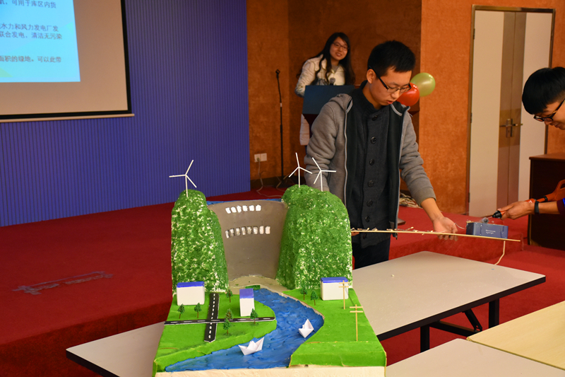 决赛开始,主持人介绍评委老师及决赛流程,选手们按照抽签顺序依次走上讲台,结合ppt介绍与实物模型展示,向评委们介绍模型的设计理念、制作过程和作品特色。“梦想工程师”们的“梦想模型”形式多样:局部的码头、大坝、船舶升降机;全景的海港、大坝;以低碳环保、生态和谐为主题的未来大港规划等等。其中,来自金神赌场 同学制作的“低碳节能、梦筑绿港”模型演示出风力、潮汐为设备供电、使船体发出声音的过程。而大禹院的同学制作的空腹重力坝也很吸引评委的眼球,该组模型预设在河流湍急、河道狭窄以及山势险峻的恶劣地形下,对比分析了实体重力和宽缝重力坝,不仅克服了两者的不足,还有节约用料、承重抗压、利于环保等优点。此外,还有将音乐厅与潮汐结合的模型,细节部分精雕细刻,堪称艺术……每组选手介绍完,评委老师都就模型的设计展开点评,提出自己的建议。六点半,参赛选手介绍完毕,丁坚老师走上讲台分享自己对科研的见解,肯定同学们的学习热情和成果,并鼓励同学们学以致用,学有所思,在科学研究的舞台上展示自我。全体人员合影留念后,第三届“梦想工程师”水工模型设计大赛圆满结束。