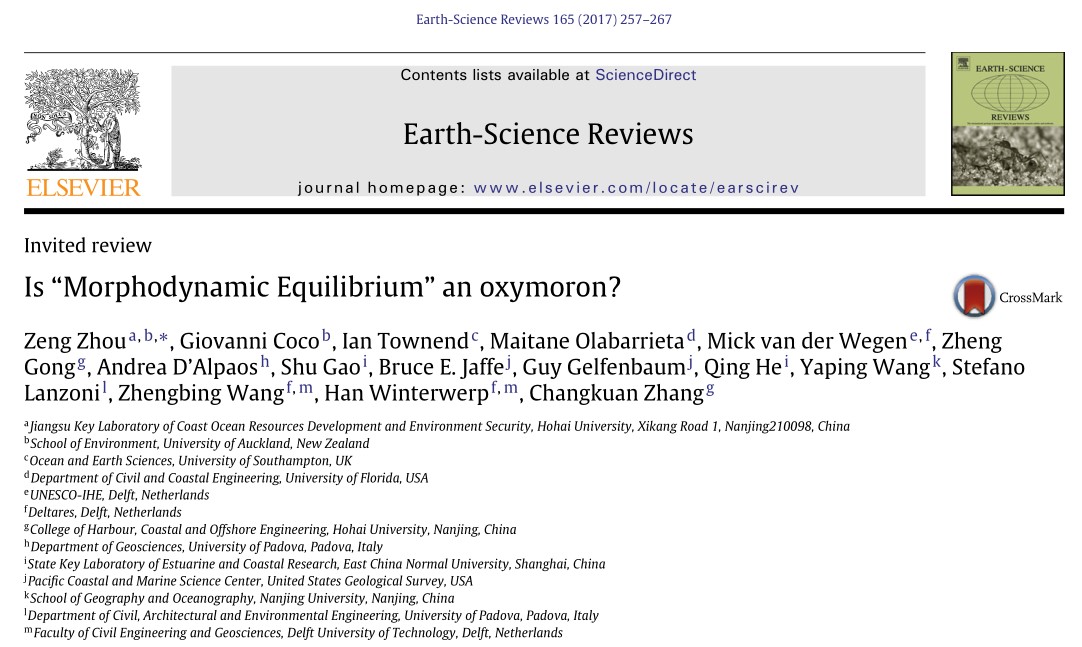 《Earth-Science Reviews》是地学领域的一区顶级期刊,近五年平均影响因子为8.969。本校其他合作作者包括张长宽教授和龚政教授。本文的论文索引为:Zhou Z., Coco G., Townend I., Olabarrieta M., van der Wegen M., Gong Z., D’Alpaos A., Gao S., Jaffe B. E., Gelfenbaum G., He Q., Wang Y., Lanzoni S., Wang Z. B., Winterwerp H. and Zhang C.K. (2017) Is “Morphodynamic Equilibrium” an oxymoron. Earth-Science Reviews, 165:257–267, doi: 10.1016/j.earscirev.2016.12.002.