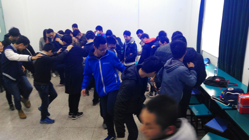 整场班会分为5个环节,分别是放松环节“互相按摩”、“看着我的眼睛”、“不打不相识”、“成王败寇”、“立下不倒的flag”。“互相按摩”环节,所有同学围成一个大圆圈,使左手指向圆心处,在主持人带领下有节奏得给前面同学按摩,捏捏肩、捶捶背、再转身,按按太阳穴、摸摸头,同学们在身体接触和互动中渐渐放松下来。“看着我的眼睛”环节,全体同学面对面站成两排,盯着对方的眼睛十秒,闪躲或闭眼眨眼的同学要向对方说出“你好厉害,我特别崇拜你”。“不打不相识”环节也是身体接触互动有趣的小活动,拉近同学们之间的关系,使每个人都自然地融入到这个大家庭中。三个小游戏结束后,教室里的气氛变得异常热闹,同学们互相之间亲密地交流着。