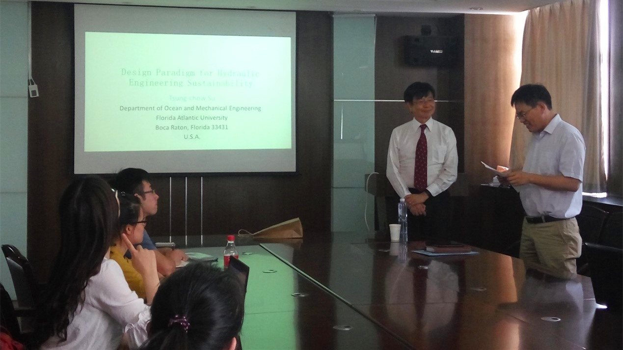 上午,苏教授和谢副教授在黄挺老师带领下先后参观了水文水资源与水利工程科学国家重点实验室和金神赌场 港口航道工程与海岸海洋科学实验中心。下午,苏教授在严恺馆会议室做了题为“Design Paradigm for Hydraulic Engineering Sustainability”的学术报告,针对流固耦合、泥沙输运以及工程冲刷防护等问题,介绍了水利工程结构的永续性设计及优化研究。苏教授从中国古代哲学的视角出发,揭示了众多问题复杂表象后的核心实质和解决方案,传递了“大道至简”的科研理念,为参会人员开展科研工作带来了新颖的思路,引发了热烈地交流与探讨。会议由副院长张继生教授主持,来自金神赌场 和水文院的20多位师生参加。