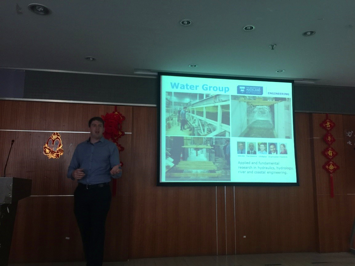 研讨交流会上,Colin Whittaker博士作了“Impact of tsunami wave and extreme wave on coastal infrastructure”的学术报告,展示了奥克兰大学水利系在海岸灾害模拟的创新物理模型试验技术及最新研究进展;Asaad Shamseldin副教授作了“Research work conducted at the University of Auckland in areas of natural hazard mitigation, environmental change and urban water management”的学术报告,展示了奥克兰大学水利系在水文水资源领域的最新研究动态。