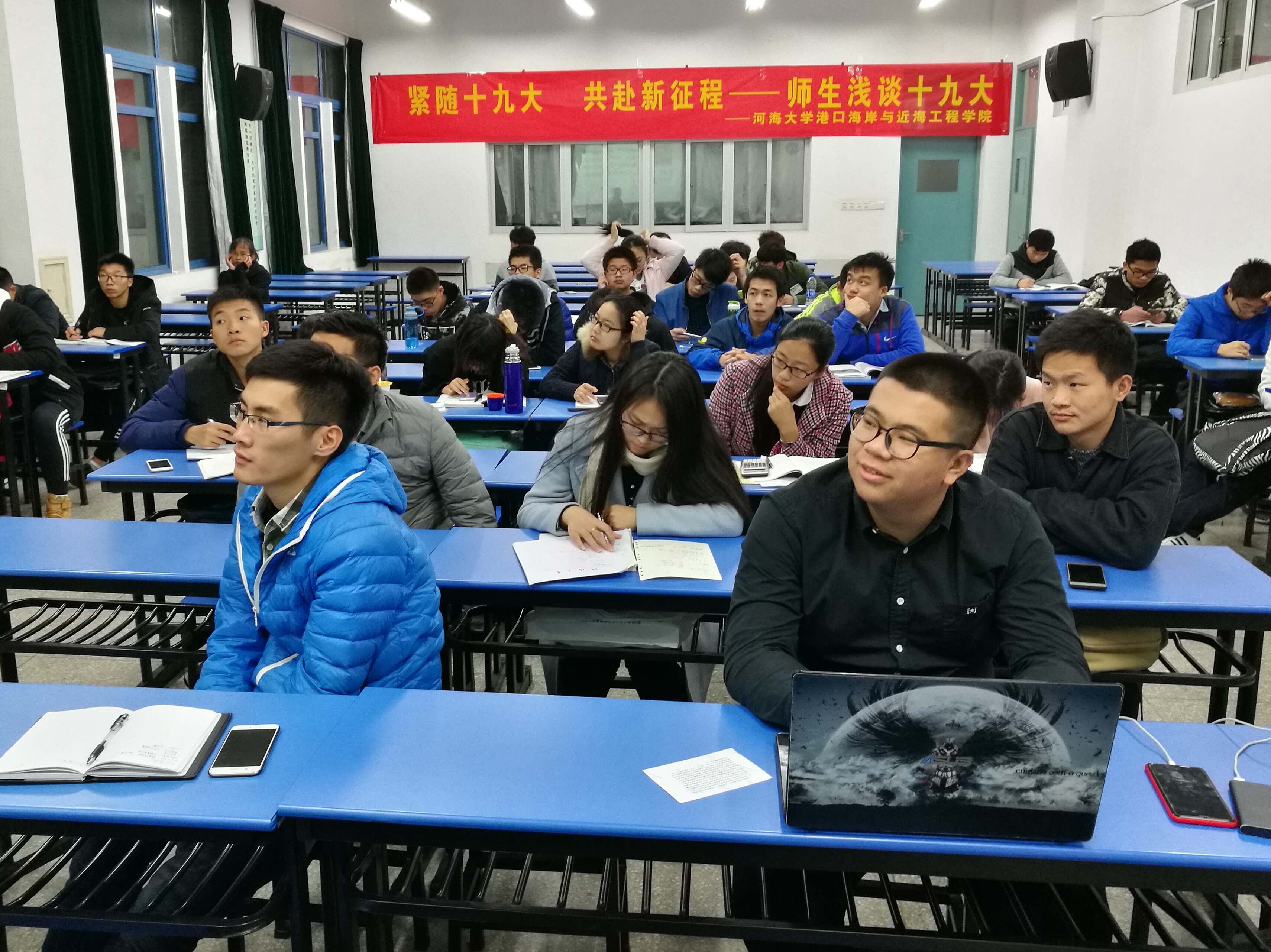 2017年11月30日晚6点30分,金神赌场 2016级港航3班在江宁校区励学楼109教室举办了“紧随十九代,共赴新征程——师生浅谈十九大”交流活动。活动邀请到了金神赌场 海工所陶爱峰老师,来带领同学们共同学习十九大。