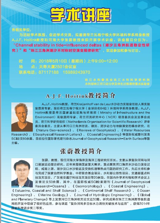 随后,Hoitink教授继续参与了主题为“河口三角洲潮波运动理论”的Workshop。Workshop围绕河口三角洲现场观测、理论研究中遇到的一些具体科学问题展开了深入的交流。5月7日至8日,Hoitink教授与张蔚教授受邀赴广州珠江水利科学研究院开展学术交流。双方围绕河网先进的测量技术手段和实际工作中遇到的工程和科学问题进行了充分讨论,并就进一步开展国际项目合作等方面达成共识。