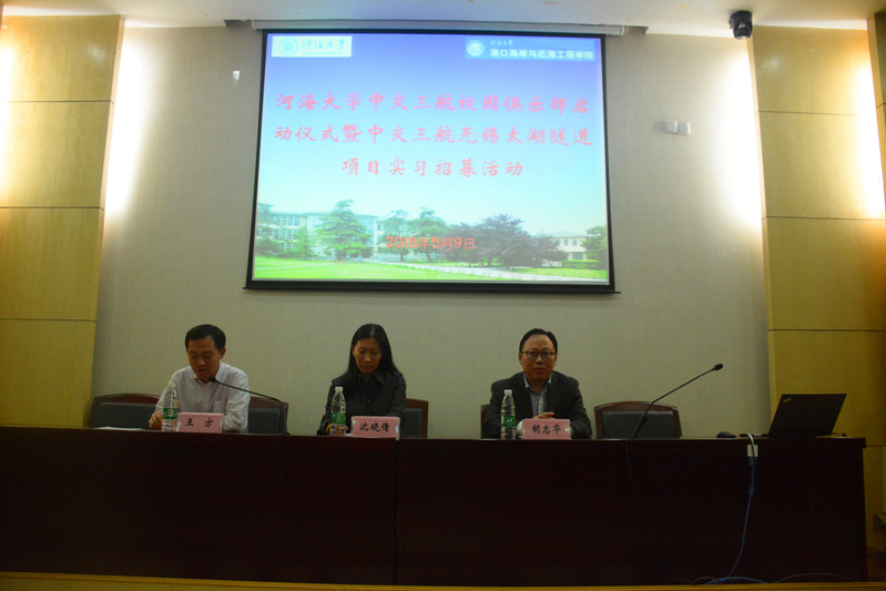 5月9日晚上6:30在河海大学闻天馆113举办了河海大学中交三航局校园俱乐部启动仪式暨中交三航局无锡太湖隧道项目实习招募活动,出席活动的领导有中交三航局人力资源部副总经理沈晓倩、招聘经理费佳颖、三航局三公司人力资源部经理、无锡太湖隧道项目部书记孟开醒,以及金神赌场-金神娱乐 党委书记胡忠华、副书记姜海霞、河海大学就业指导中心主任王方,金神赌场 2015级全体学生参加了此次宣讲会。
