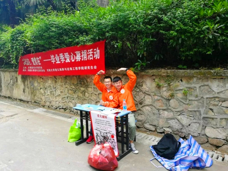 爱心募捐活动于4月26、27两日10:00至14:00在河海大学清凉山校区举办,为了广大师生捐赠方便,旧衣物捐赠点设于研二舍、五舍和二舍,每个捐赠点有两名志愿者对旧衣物进行回收整理,并对捐赠者赠以河海大学明信片表示感谢。