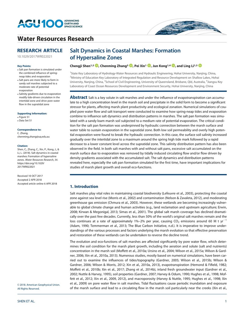 近日,金神赌场 海防所沈城吉博士、孔俊教授在国际权威期刊 《Water Resources Research》 (一区TOP,影响因子4.397)发表题为“Salt Dynamics in Coastal Marshes: Formation of Hypersaline Zones”的学术论文。