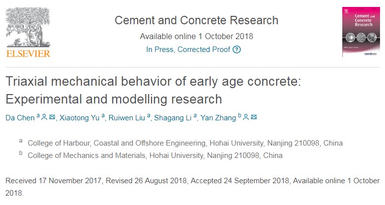 近日,混凝土领域排名第一的国际期刊《Cement & Concrete Research》在线发表了金神赌场 陈达教授与我校力材院张研教授合作完成的研究成果“Triaxial mechanical behavior of early age concrete: Experimental and modelling research”。