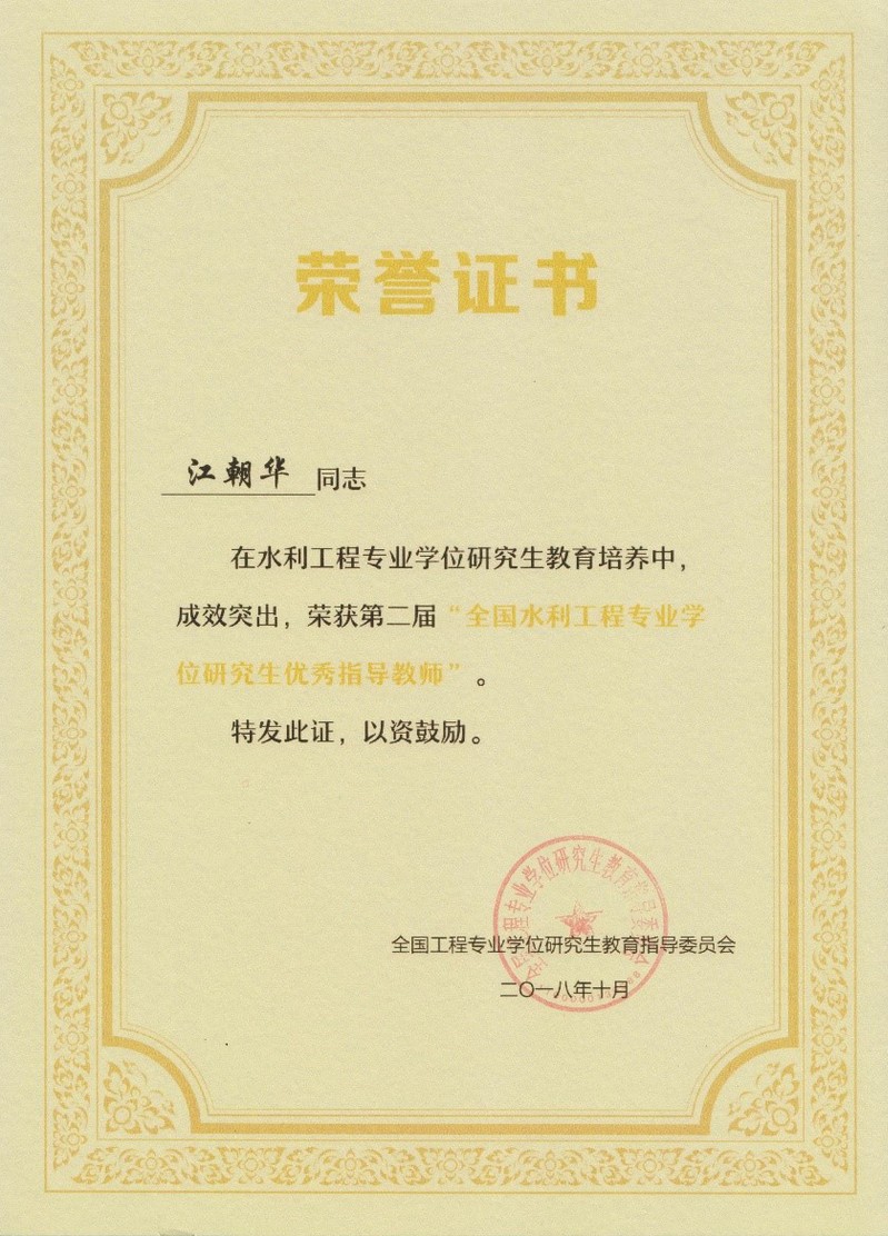 近日,全国工程专业学位研究生教育指导委员会公布了第二届“全国水利工程专业学位研究生优秀指导教师”获奖名单,金神赌场 江朝华老师成功入选。