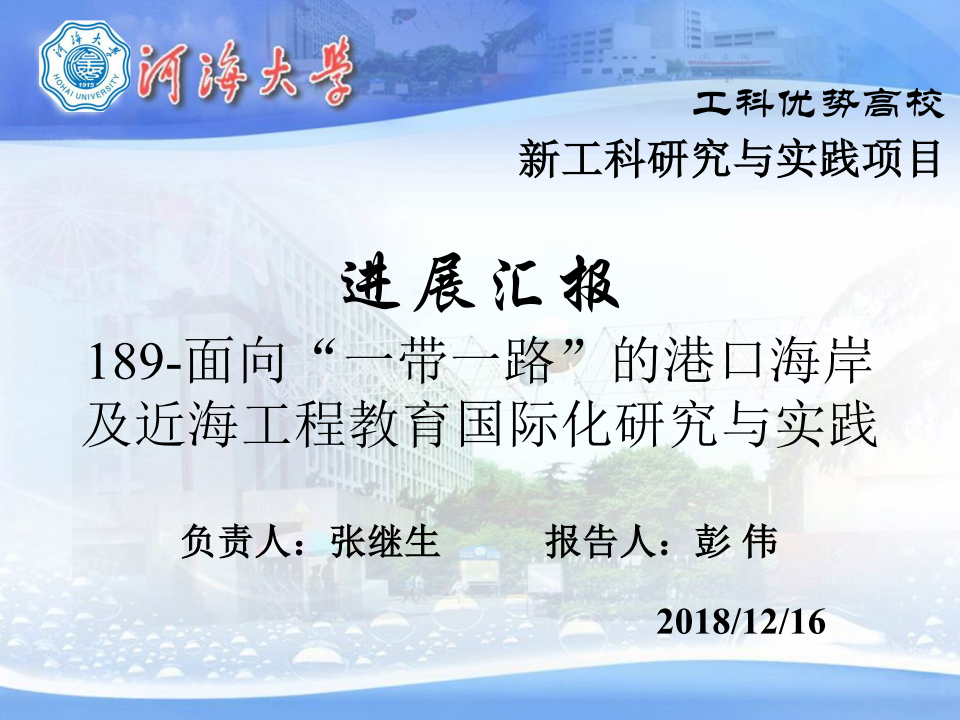 12月16日,在天津大学举行了工科优势高校新工科研究与实践项目年度进展交流会,金神赌场 张继生教授负责的#189课题——“面向“一带一路”的港口海岸及近海工程教育国际化研究与实践”进行了汇报。本次会议由教育部高等教育司、教育部高等教育教学评估中心指导,教育部新工科研究与实践专家组主办,天津大学承办,旨在全面贯彻全国教育大会精神,落实新时代全国高等学校本科教育工作会议要求,扎实推进新工科工作建设实施。