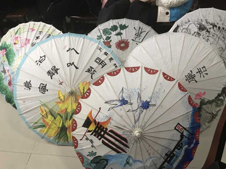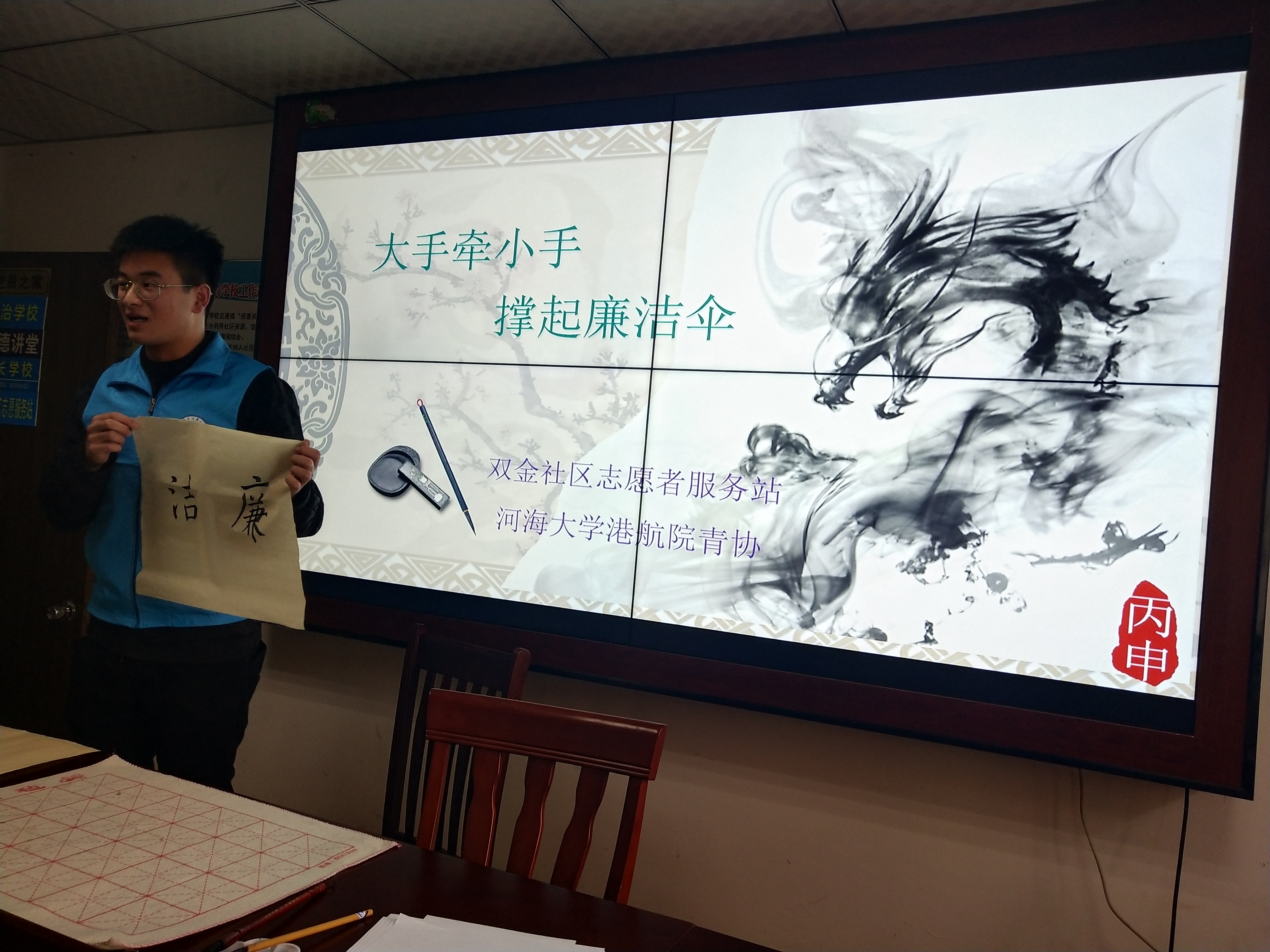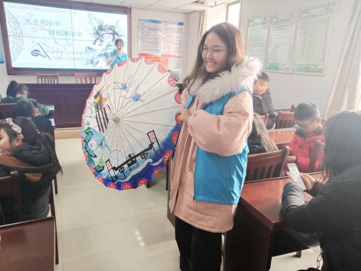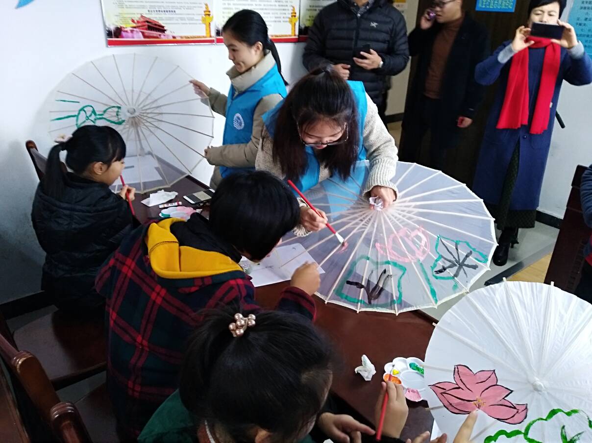 志愿者们精心地为孩子们准备了空白油纸伞、颜料、画笔、调色盘等绘画工具,为了使孩子们发挥他们创意无穷的小脑袋,青协志愿者进行现场书法展示和创作来激发创作灵感。随后志愿者发放材料供孩子和家长们创作。