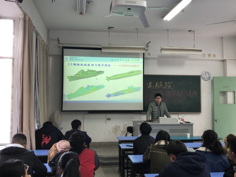 汤冬老师带来的是船舶与海洋工程结构动力性能分析,主要内容为舰艇机械振动与声辐射特性、舰艇机械振动与噪声预报方法研究、舰艇机械振动与噪声相关试验研究、舰艇典型结构波动特性研究四个方面,他向同学们介绍了舰艇机械的专业知识,让同学们获益良多。