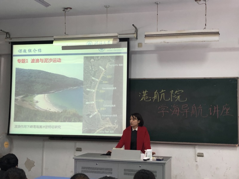 冯曦老师的阐述分为波浪与泥沙运动、气候与海洋环境变化和近海污染物追踪三个板块。其中,她重点介绍了波浪对地形的影响、波浪与建筑物的关系和裂流、水跃两个自然现象。讲述期间,她展示了不少研究生的研究和论文,激励同学们向科研进军。