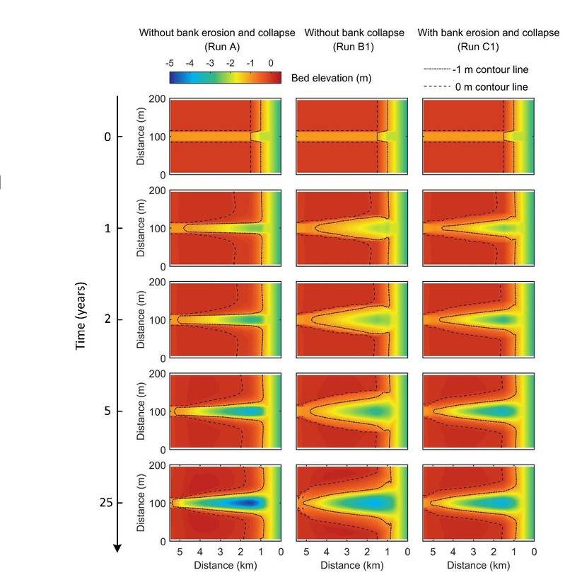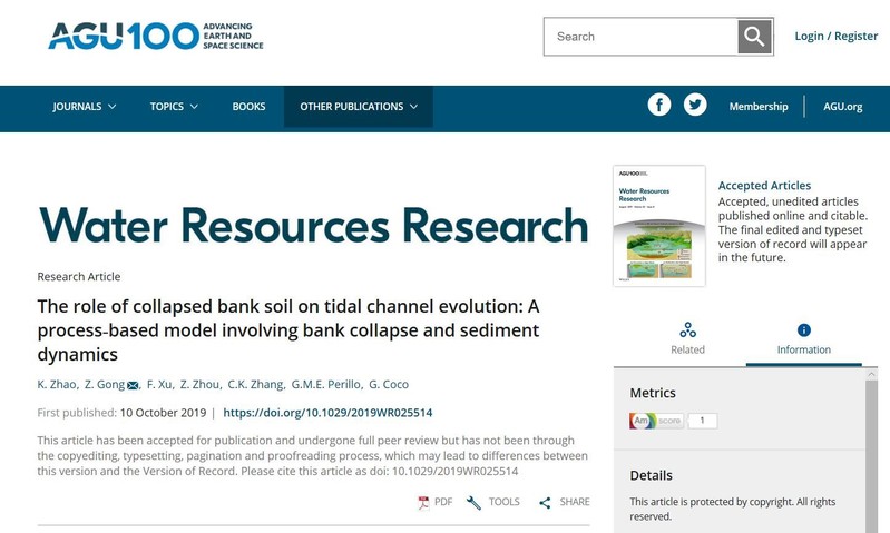 近日,金神赌场 潮滩动力地貌研究团队博士生赵堃在国际权威期刊《Water Resource Research》(一区Top, 2018年影响因子4.36)上发表了题为“The role of collapsed bank soil on tidal channel evolution: A process-based model involving bank collapse and sediment dynamics”的学术论文,是继该团队在知名刊物《Geomorphology》发表岸壁坍塌对潮沟拓宽贡献研究后的又一突破。论文第一作者为金神赌场 赵堃博士生,合作作者包括龚政教授、周曾教授、张长宽教授,以及华东师范大学徐凡博士、阿根廷海洋研究所G. M. E. Perillo教授和新西兰奥克兰大学Giovanni Coco副教授。