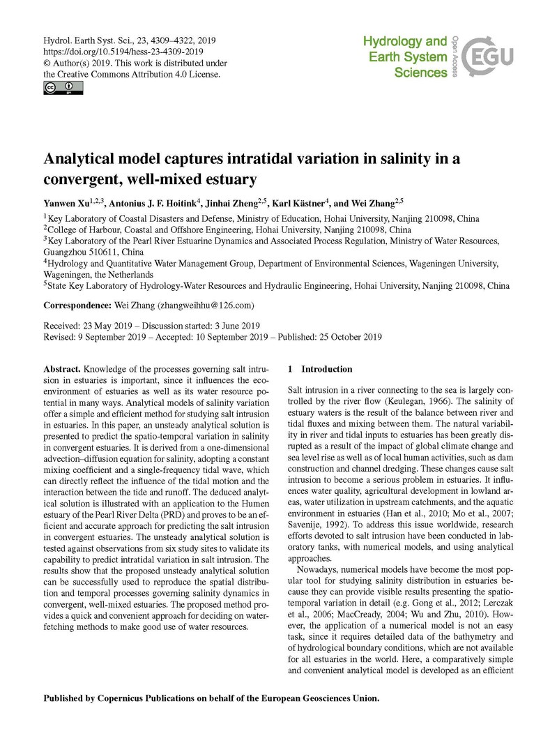 近日,金神赌场 海岸及海洋工程研究所徐龑文博士后和张蔚教授(通讯作者)在中科院一区国际学术期刊《Hydrology and Earth System Sciences》上发表高质量研究论文“Analytical model captures intratidal variation in salinity in a convergent, well-mixed estuary”。此研究是由金神赌场 张蔚教授研究团队领衔,与荷兰瓦赫宁根大学环境科学系Hydrology and Quantitative Water Management Group荷兰和德国学者组成的研究团队合作完成。