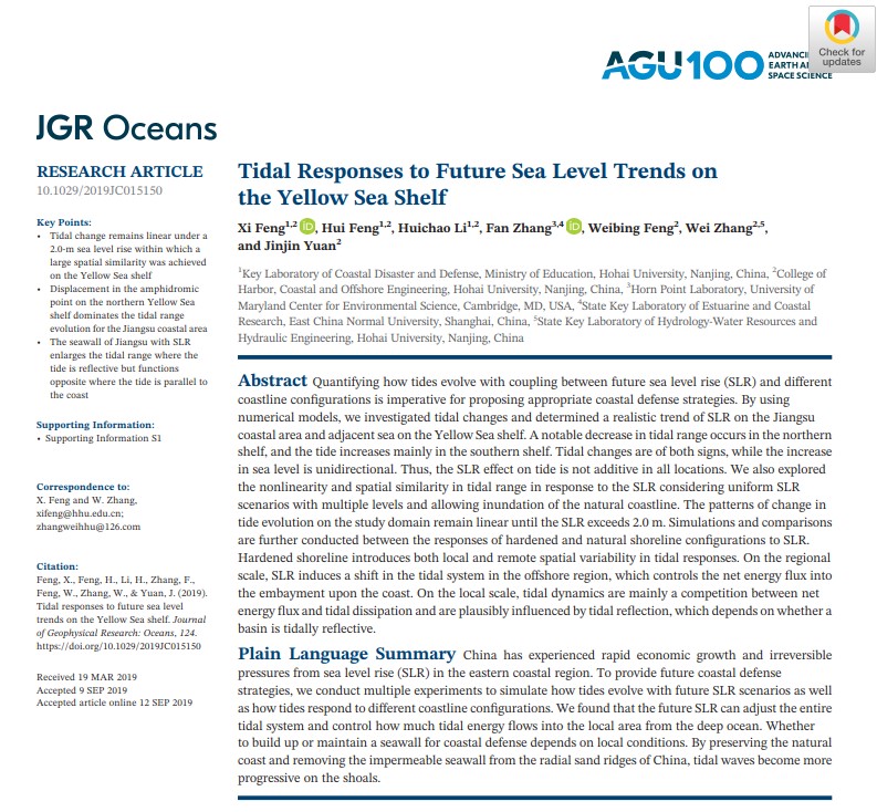 近日,隶属海岸灾害及防护教育部重点实验室(河海大学),(Key Laboratory of Coastal Disaster and Defence (Hohai University), Ministry of Education)的冯曦老师携研究生冯辉、李慧超等在国际学术TOP期刊《Journal of Geophysical Research: Oceans》上发表高质量研究论文“Tidal responses to future sea level trends on the Yellow Sea shelf”。该论文阐明了复杂海岸带环境下,海平面上升与潮能演化之间的动态规律,首次界定了在中国特有的开放式海岸条件下,近岸潮能演变规律由线性形态到非线性形态的零界位置。同时,指出了在刚性和柔性护岸不同条件下,黄海大陆架近岸潮能应对海平面上升的自适性。该论文反映了平行岸线的前进潮波与垂直岸线的类驻波潮波与不同护岸之间的组合关系;从运动机制与动力机制两方面分别揭示了柔性护岸与刚性护岸工程对近未来(100年间)潮能发展的状态。该成果不仅具有重要的理论意义,而且对目前我国的生态护岸工程也有广泛的现实借鉴作用。
