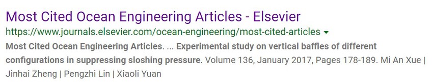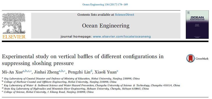 金神赌场 教师薛米安、郑金海、四川大学林鹏智、理学院苑晓丽等合作发表的科研论文“Mi-An Xue, Jinhai Zheng, Pengzhi Lin, Xiaoli Yuan, 2017. Experimental study on vertical baffles of different configurations in suppressing sloshing pressure. Ocean Engineering, 136: 178-189”入选《Ocean Engineering》期刊自2016年以来被引用最多的海洋工程文章“Most Cited Ocean Engineering Articles”,显示了金神赌场 教师在液体晃荡动力学研究领域的国际影响力。论文自2017年发表两年来已被Scopus引用43次,SCI引用34次。2016年-2019年Ocean Engineering合计发表论文3196篇,期中引用最多的25篇被选为“Most Cited Ocean Engineering Articles”,该论文位列第13篇,也是目前为止以河海大学为第一单位唯一入选的一篇论文。