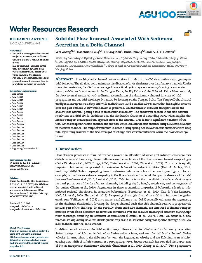 近日,海岸及海洋工程研究所张蔚教授团队在中科院一区国际权威学术期刊《Water Resources Research》上在线发表了高质量研究论文“Subtidal Flow Reversal Associated With Sediment Accretion in a Delta Channel”。