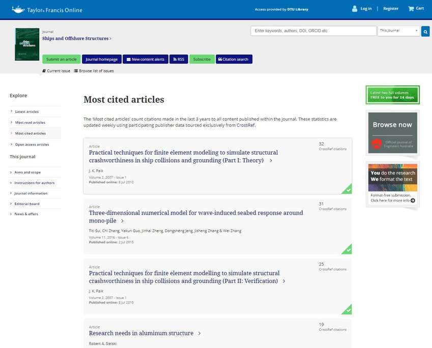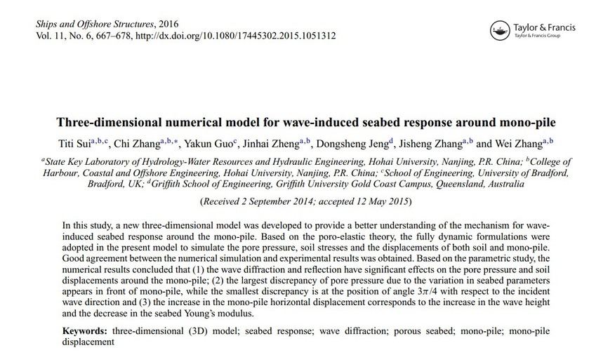 金神赌场 教师隋倜倜、张弛、郑金海、张继生、张蔚、英国布拉德福德大学郭亚昆、澳大利亚格里菲斯大学郑东生等合作发表的科研论文“Titi Sui, Chi Zhang, Yakun Guo, Jinhai Zheng, Jisheng Zhang, Dongsheng Jeng and Wei Zhang, 2016. Three-dimensional numerical model for wave-induced seabed response around mono-pile. Ships and Offshore Structures, 11(6): 667-678”入选《Ships and Offshore Structures》期刊(2019中信所分区二区期刊)近三年(2016-2019)被引用最多的文章“Most Cited Articles”,该论文位排名第2(共10篇入选,论文总数777篇),显示了金神赌场 教师在波浪-海床-结构物相互作用研究领域的国际影响力。该论文自2016年发表以来已被SCI引用33次(Web of Science Core Collection),也是目前为止以河海大学为第一单位唯一入选的一篇论文。