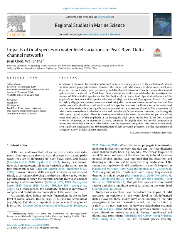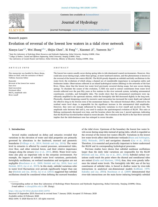 近日,金神赌场 二年级硕士研究生罗小雅和陈娟分别在国际权威期刊“Journal of Hydrology”(影响因子:4.405)和“Regional Studies in Marine Science”(影响因子:1.462)以第一作者发表高水平论文“Evolution of reversal of the lowest low waters in a tidal river network”和“Impacts of tidal species on water level variations in Pearl River Delta channel networks”。
