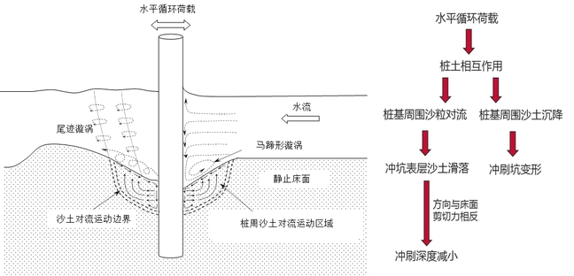 图3.3.3 水平循环荷载作用下的冲刷机理示意图 提出了同时考虑水动力和水平循环荷载的单桩基础冲刷深度预测新公式,解决了复杂海况中结构强振动条件下的传统冲刷公式计算误差大的问题。