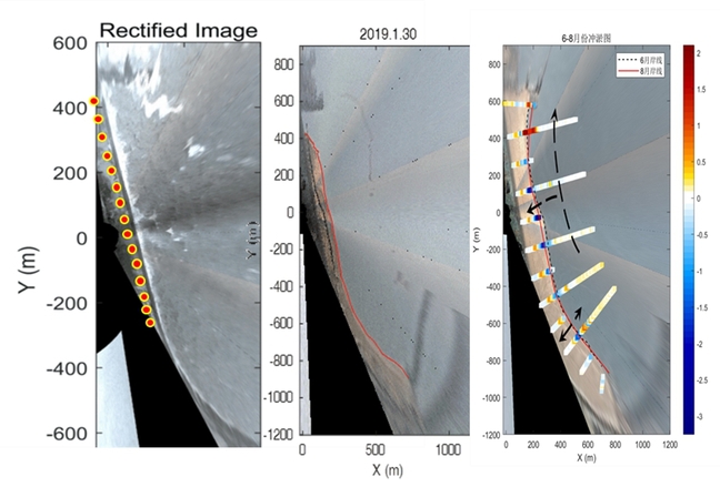 图3.4.2 海岸带岸基数字影像监测系统 图3.4.3 中国近海高精度波浪数据库 揭示了波浪冲越输沙及其与后滩的相互作用是反射型人工沙滩地貌调整再造的重要影响机制,发现常浪条件下三类不同的沙坝向岸形态演变模式和风暴条件下滩肩侵蚀滞后响应的原因。 图3.4.4 人工沙滩初期演变观测结果