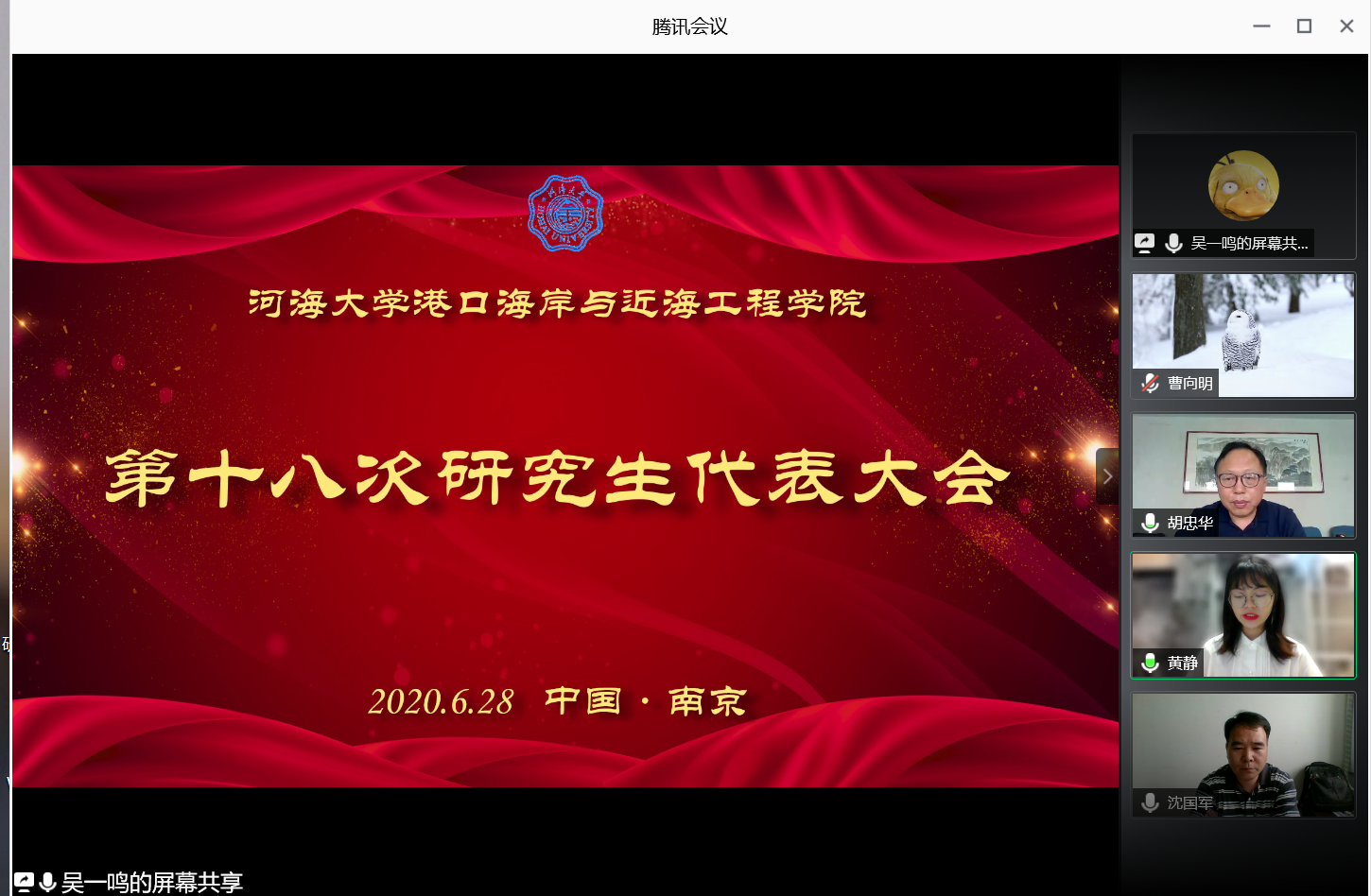 2020年6月28日下午2点30分,金神赌场 第十八次研究生代表大会通过腾讯会议在线上顺利召开,金神赌场 党委书记胡忠华,副书记沈国军、团委书记王玲、研究生辅导员林凡出席会议,第十七届研究生会全体成员、各级研究生代表团成员参加会议。