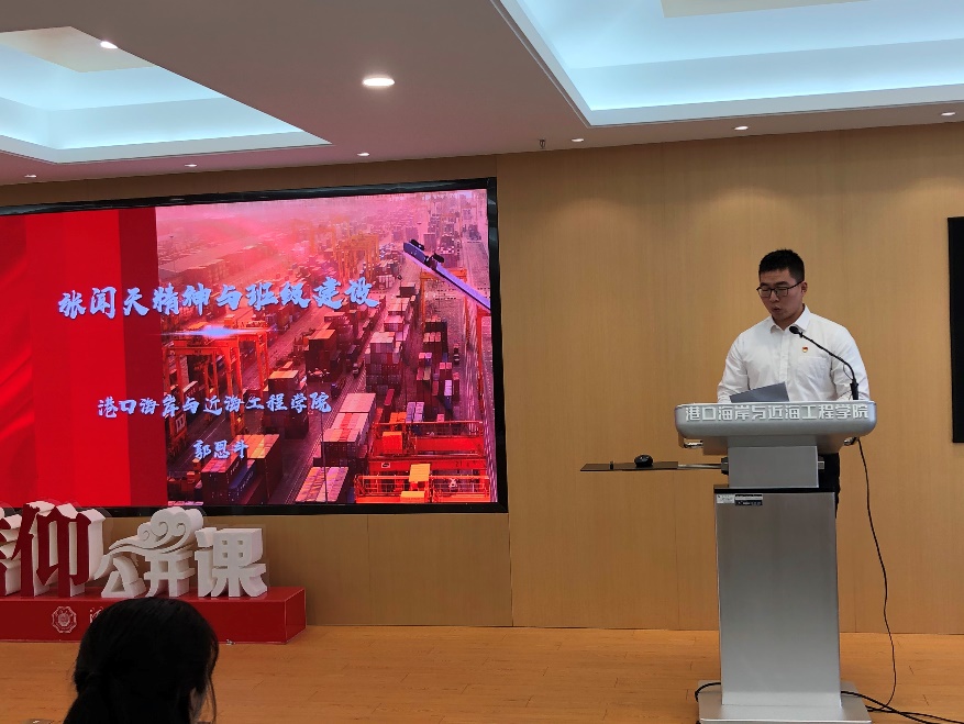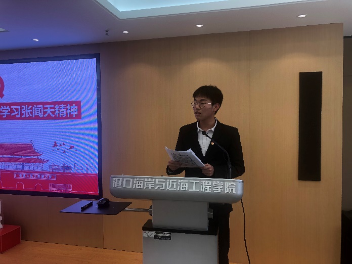 仪式的最后一项议程,由金神赌场 2017级本科生、港航3班班长郭恩斗同学以张闻天精神与班级建设为主题进行汇报。他从班级的整体建设情况、优秀个人代表、未来建设展望做了简要汇报。同时,身为河海大学校史讲解员的他,结合对张闻天事迹的讲解经验与班级建设经历,分享了自己的思考与体会。