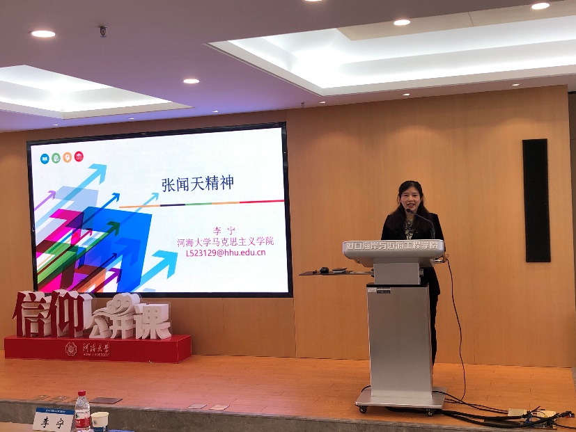 赠书仪式毕,河海大学马克思主义学院副院长李宁教授就《张闻天精神》展开讲授。2020年,正值张闻天同志诞辰120周年,学习张闻天精神也是学习“四史”的重要内容之一。李宁教授指出:“张闻天精神是在长期的革命和社会主义建设过程中体现出来的高尚的精神品质,它囊括了孜孜不倦的学习精神、热心政治的爱国精神、追求真理的科学精神、忠于信仰的革命乐观主义精神和党和人民利益高于一切的奉献精神”。在长期的革命和建设岁月中,张闻天为祖国为人民作出了卓越贡献,也为河海大学留下了宝贵的“红色基因”,因此对于党史教育,她强调“党史教育要让人从平凡中看到伟大,在伟大中感到平凡”。在讲授最后,她呼吁广大党员同志应以老一辈河海人的精神为指引,以新时代新青年的担当为要求,以史为鉴,失志拼搏。