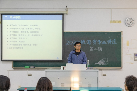 2020年11月13日下午,2020级海洋资源开发技术一班专业讲座第二期在江宁校区致高楼A208教室成功举办。本次讲座邀请到了海岸带资源与环境研究所徐振山老师和南京海事职业技术学院王天闻老师作为主讲嘉宾,两位老师从大学生活、行业前景等方面展开了讲座。