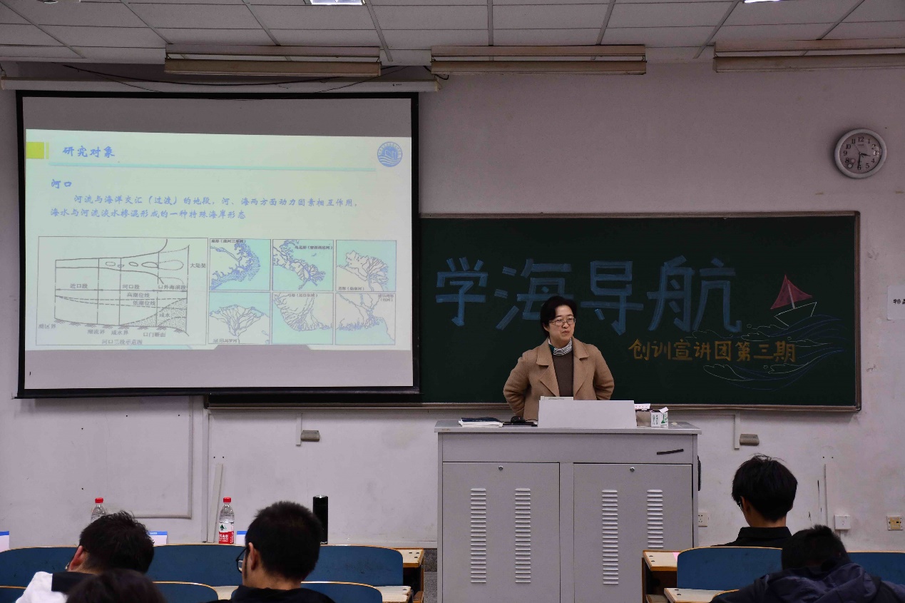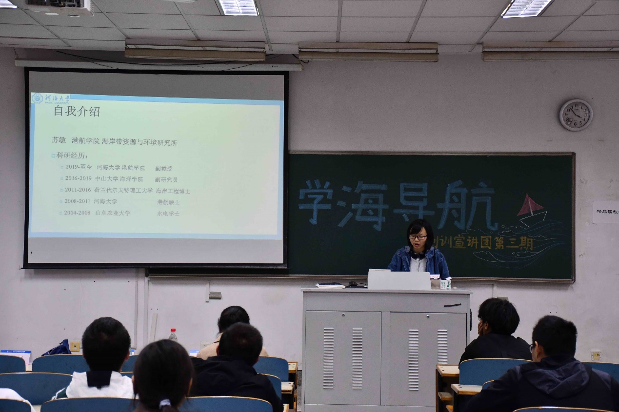 苏敏老师以河口海岸动力地貌学为主要研究方向,首先向同学们介绍了相关的科研情况,以港珠澳大桥和河口围垦为例向同学们详细介绍其研究内容,让同学们具体了解了科研内容,激起同学们的科研兴趣。
