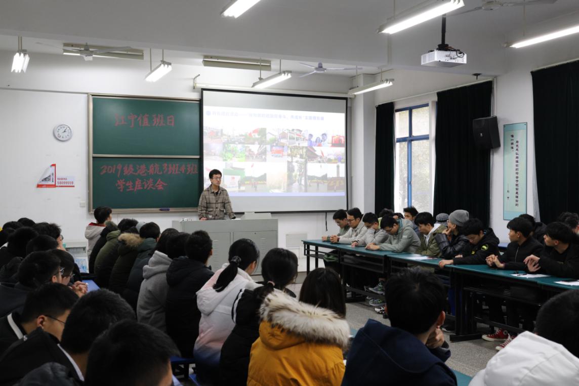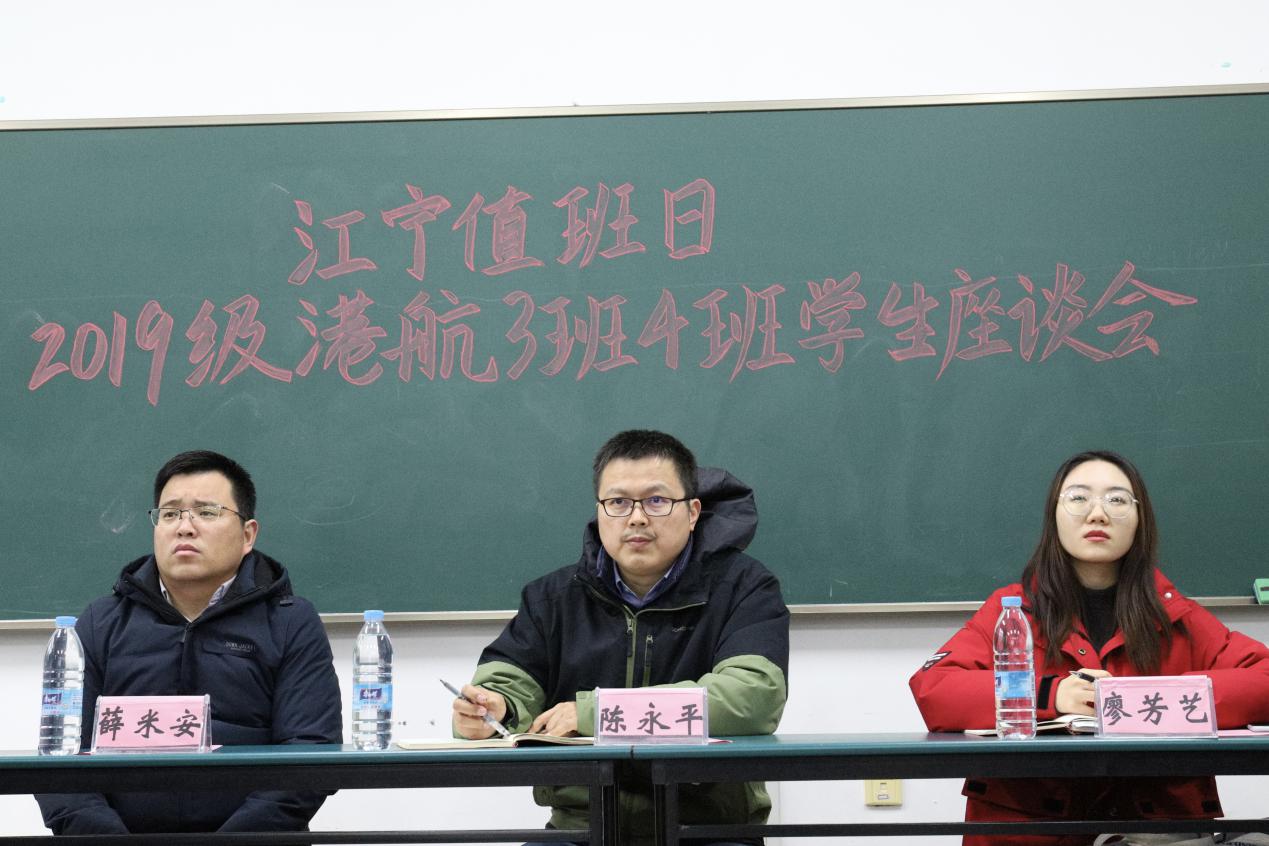2020年12月8日下午14时,江宁值班日—2019级港航3班4班学生座谈会在江宁校区励学楼A209举行。金神赌场 陈永平副院长、2019级港航4班班导师薛米安老师、辅导员廖芳艺老师出席了本次座谈会。
