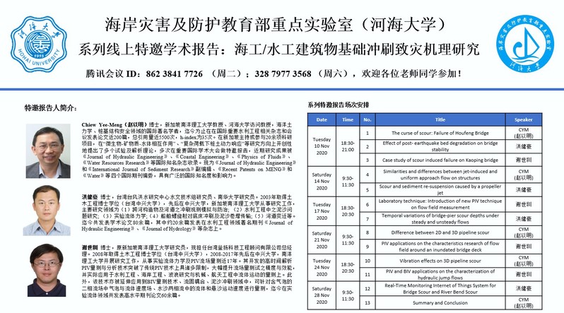 2020年11月10-28日,受金神赌场 海岸灾害及防护教育部重点实验室管大为青年教授邀请,南洋理工大学赵以明教授、南华大学洪健豪研究员、台湾釜扬科技工程顾问有限公司总经理谢世圳研究员三位专家学者为我校师生开展了主题为“海工/水工建筑物基础冲刷致灾机理研究”的13场系列线上学术报告。系列特邀报告主题鲜明、内容丰富,涵盖了桥梁、管线、风机等多种结构物基础冲刷机理、冲刷物理模型试验技术、冲刷现场观测等方面的最新研究进展。