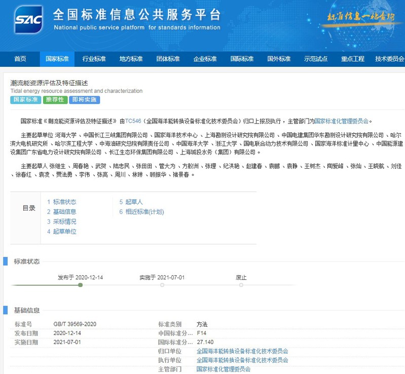2020年12月14日,金神赌场 张继生教授主编的国家标准《潮流能资源评估及特征描述》 (GB/T 39569-2020)由国家标准化管理委员会正式发布,于2021年7月1日起实施。