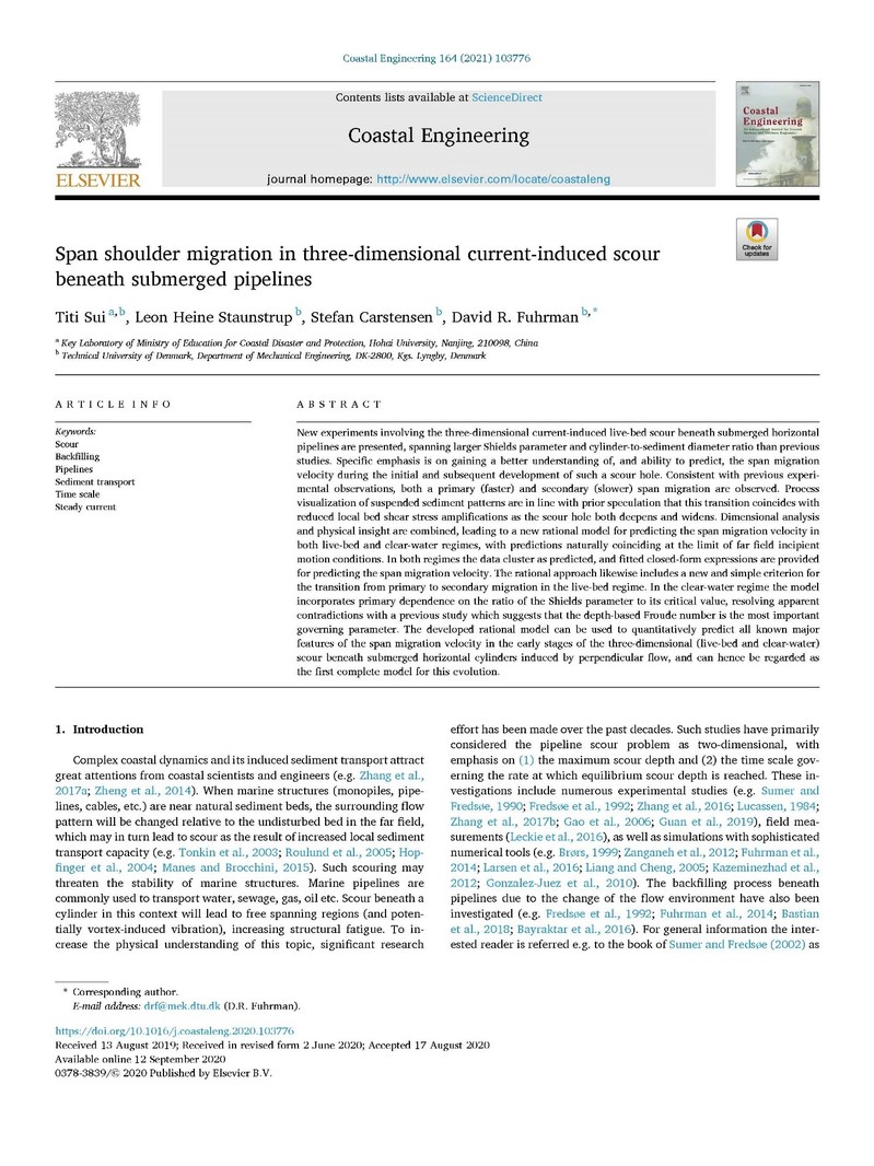 近日,金神赌场 教师隋倜倜在海底管道冲刷领域取得进展,与丹麦科技大学海岸工程团队合作研究成果在一区期刊《Coastal Engineering》上发表,标题为“Span shoulder migration in three-dimensional current-induced scour around submarine pipelines”。