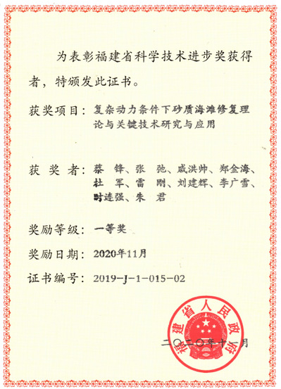 近日,福建省科学技术奖励大会在福州市举行,会上颁发了2019年度福建省科学技术奖。由我校和自然资源部第三海洋研究所等单位合作完成的项目“复杂动力条件下砂质海滩修复理论与关键技术研究与应用”获得2019年度福建省科技进步奖一等奖。河海大学为第二完成单位,金神赌场 张弛教授为第二完成人,郑金海教授为第四完成人。