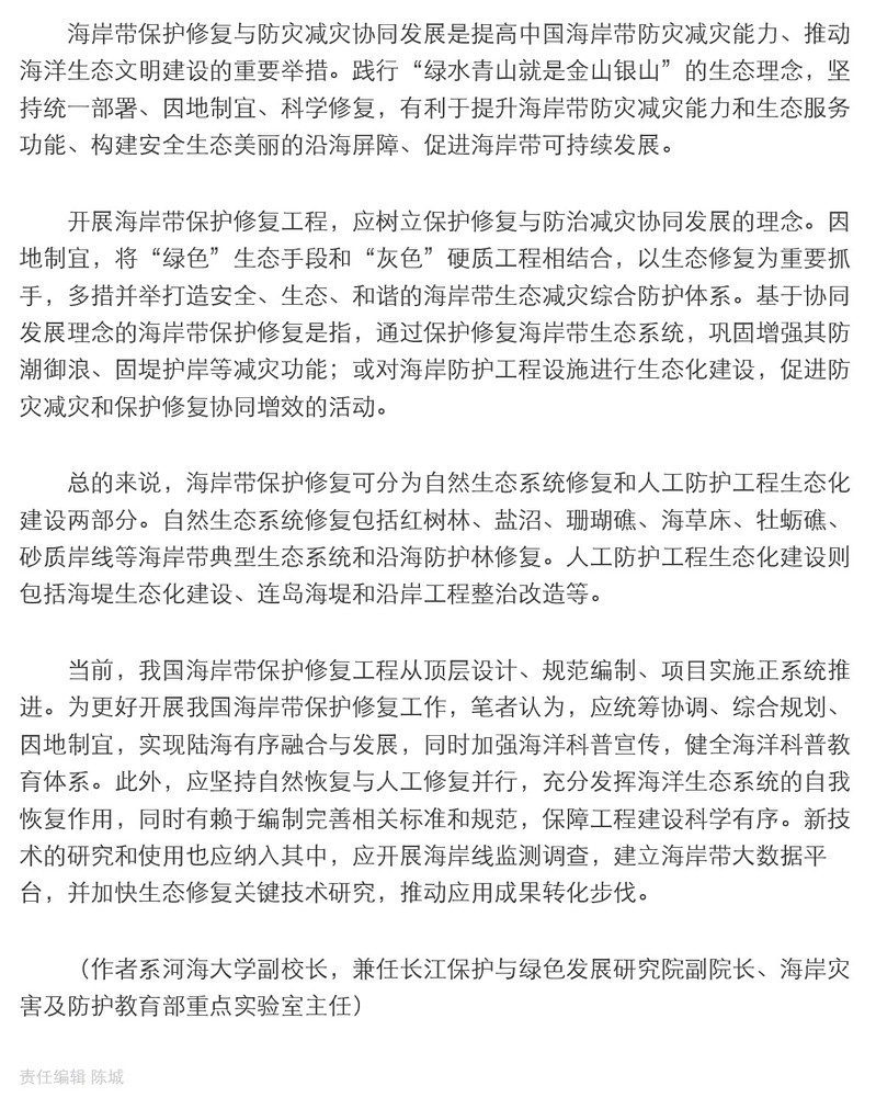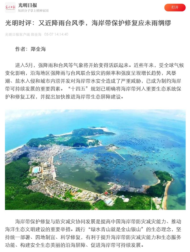 2021年05月07日,金神赌场 郑金海教授在《光明日报》的时评栏目,发表题为《光明时评:又近降雨台风季,海岸带保护修复应未雨绸缪》的署名文章。探讨了制约海岸带可持续发展的因素,并提出了我国海岸带保护修复与防灾减灾协同发展的工作建议。全文如下: