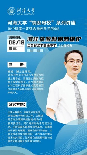 8月18日,首场河海大学“情系母校”系列讲座在江苏省梁丰高级中学举行,金神赌场 院长龚政教授作为江苏省梁丰高级中学1993届校友,应邀作了题为《海洋资源开发利用与保护》的讲座,近800名高中学子通过网络在线聆听了讲座。