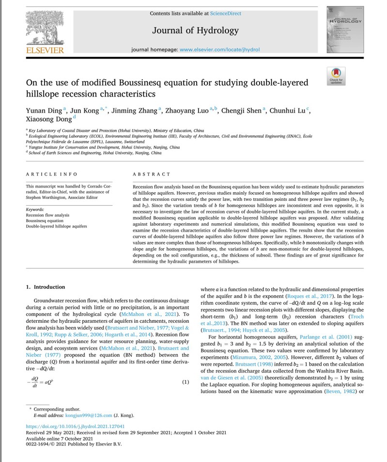 近日,金神赌场 孔俊教授指导的2019级硕士研究生丁宇楠在《Journal of Hydrology》上发表了题为“On the use of modified Boussinesq equation for studying double-layered Hillslope Recession Characteristics”的学术论文。该研究是继孔俊教授2016年提出的Kong-HSB理论的又一重要突破。