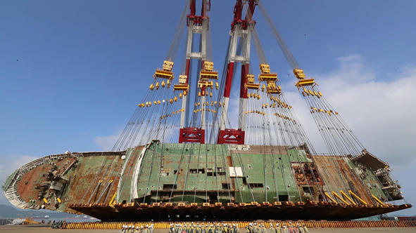 在系缆评估理论方面,建立了纤维系缆的本构模型,研究了系缆蠕变率、蠕变破断、系缆载荷历史,磨合方法、系缆动刚度、阻尼和疲劳寿命,发展了系缆的力学性能评估理论方法。基于这些研究成果与江苏省九力绳缆有限公司,开展了产学研合作,共同针对韩国“世越号”沉船打捞工程的吊缆特殊性,开展了全尺寸的实验研究(如图2所示),建立了吊缆实验技术和实验流程,有效去除了吊缆的结构性伸长,保障了韩国“世越号”沉船打捞工程的吊缆服役安全,如图3所示。这一成功应用证明了所创建的纤维吊缆安全评估方法的有效性,填补了我国在全尺寸高强纤维吊缆的研究空白。