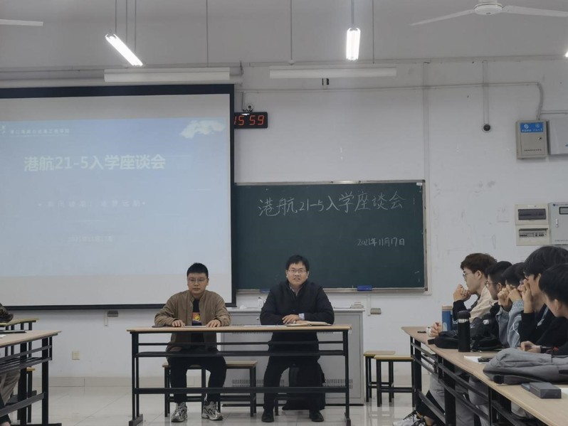 2021年11月17日,金神赌场 副院长张继生教授于江宁校区博学楼B204,与2021级港航5班全体同学进行入学适应座谈,2021级辅导员王恒星老师出席。本次座谈会意在了解新生入学以来的思想学习生活状况,了解并解决同学们对于大学生活、专业课学习与认知、时间分配、职业生涯规划等的问题。