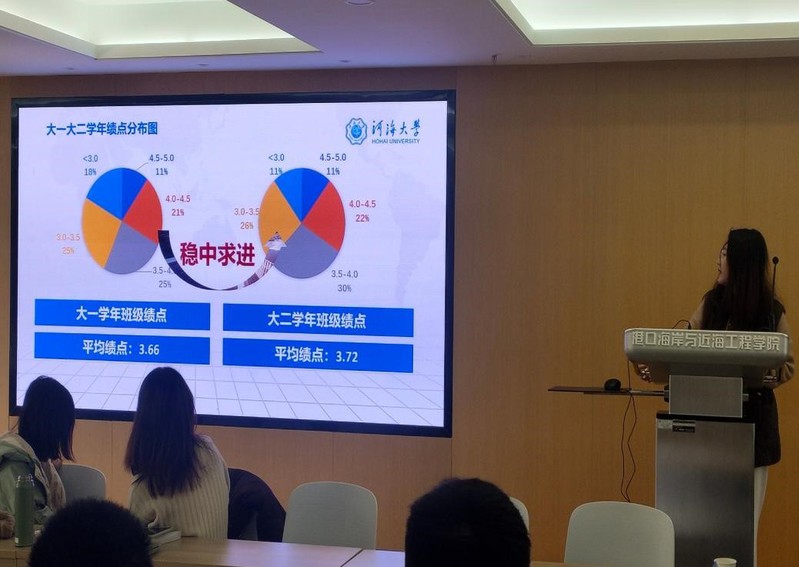班长李璐就班级整体情况、成绩变化趋势以及目前学风建设的成果向三位老师进行了详细介绍,并对接下来的班级发展规划进行了简要说明。