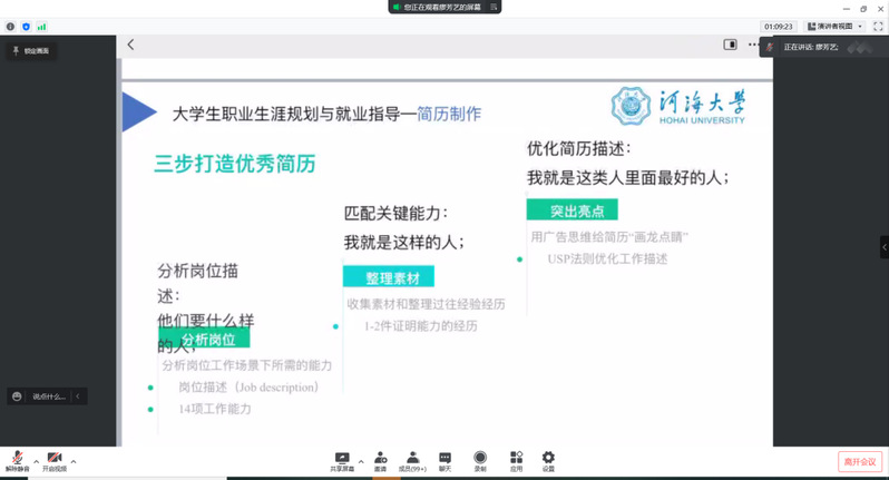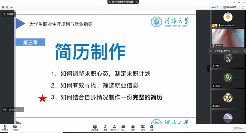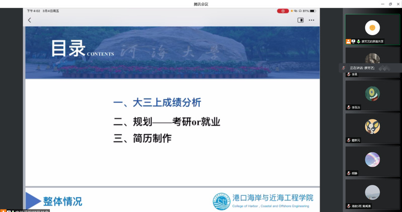2022年3月4日下午,金神赌场 2019级在线上开展职业生涯规划和简历制作培训会。大会由2019级本科生辅导员廖芳艺主持,2019级全体学生及家长参加本次大会。廖芳艺老师就年级整体学习情况、大三学年生涯规划、简历制作培训进行分享。