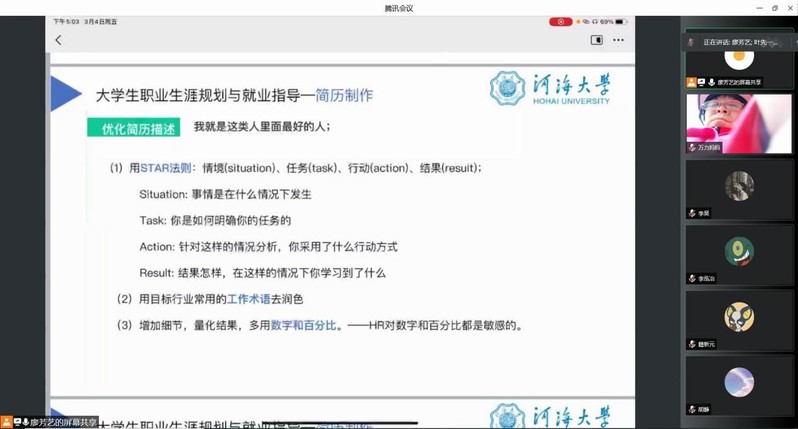 无论是对于升学还是就业,一份优秀的简历都必不可少。廖老师根据自身过往职业经验,为学生讲授了简历制作的“一个中心、两个基本点”,以展示工作技能为核心,有针对性、客观具体。廖老师特别强调简历“不是最优秀而是最合适”,简历一定要因目标而异。关于如何优化简历,廖老师介绍了“三用法则”,用STAR法则、用工作术语、多用数字百分比。