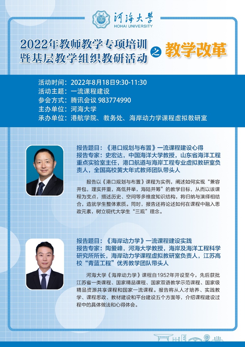 2022年8月18日上午,金神赌场 、教务处和教育部海岸动力学课程虚拟教研室共同组织开展了2022年教师教学专项培训暨基层教学组织教研活动。本次培训的主题是围绕一流课程建设,研讨教学改革问题。会议采取线上会议的形式,来自河海大学、天津大学、大连理工大学、大连海洋大学、东南大学、江苏科技大学、中国海洋大学、鲁东大学、长沙理工大学、广东海洋大学、重庆交通大学、三峡大学、江苏海洋大学、扬州大学等高校的70余名老师参加了本次会议。